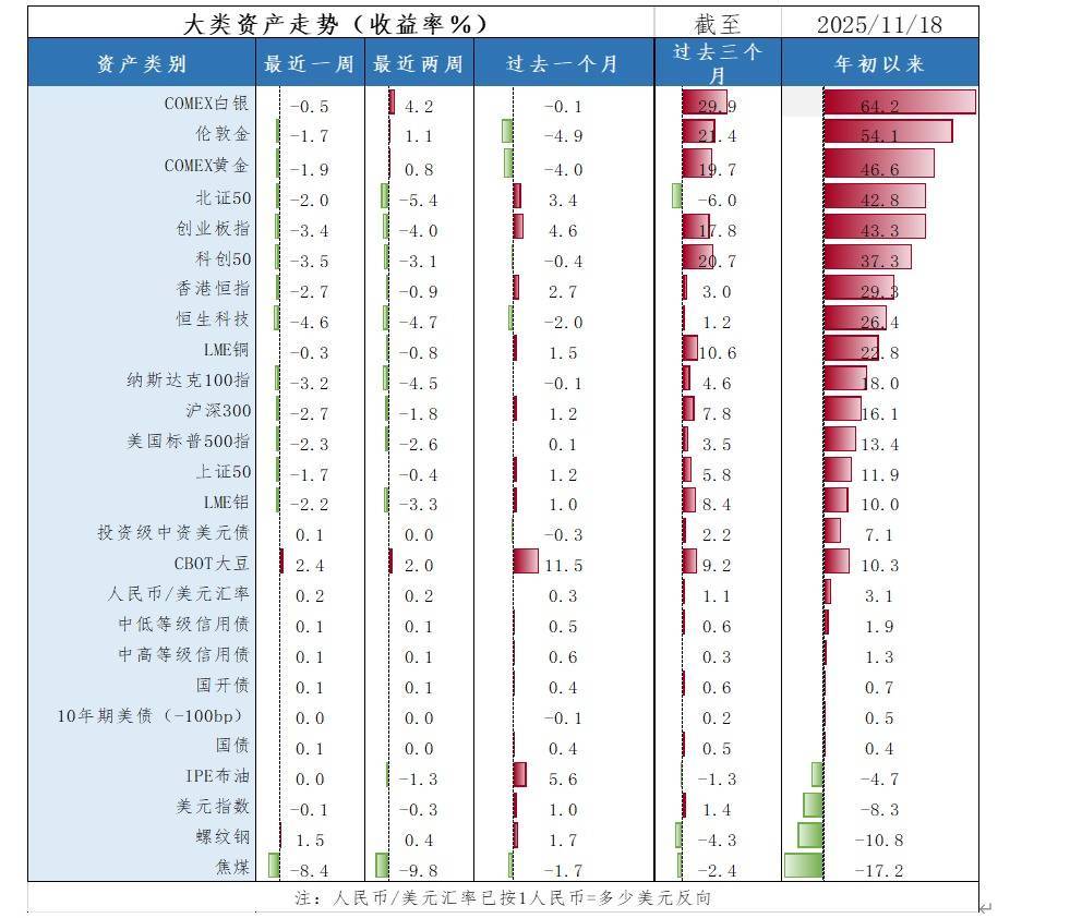 从周度数据看,中国宏观经济的基本面和美国12月降息的不确定性以及日本首相不当言论引发的全球风险溢价的陡然提升在大类资产的走势上映射得非常明显。商品中的焦煤,恒生科技以及科创50、创业板、纳斯达克等权益资产下跌,与之对应,债券走势尚可。